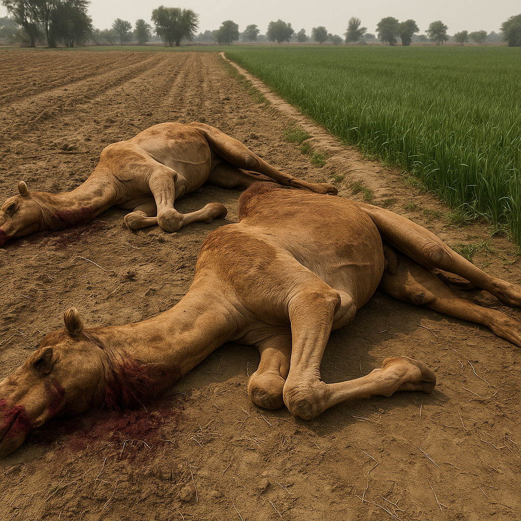 A disturbing incident from the Cholistan region of Rahim Yar Khan has sparked public outrage after a local landlord allegedly killed two camels with axes for entering his cultivated farmland. The owner of the camels, Abdul Khaliq, claims that the animals were brutally attacked by influential individuals in the area following a dispute over crop damage.
