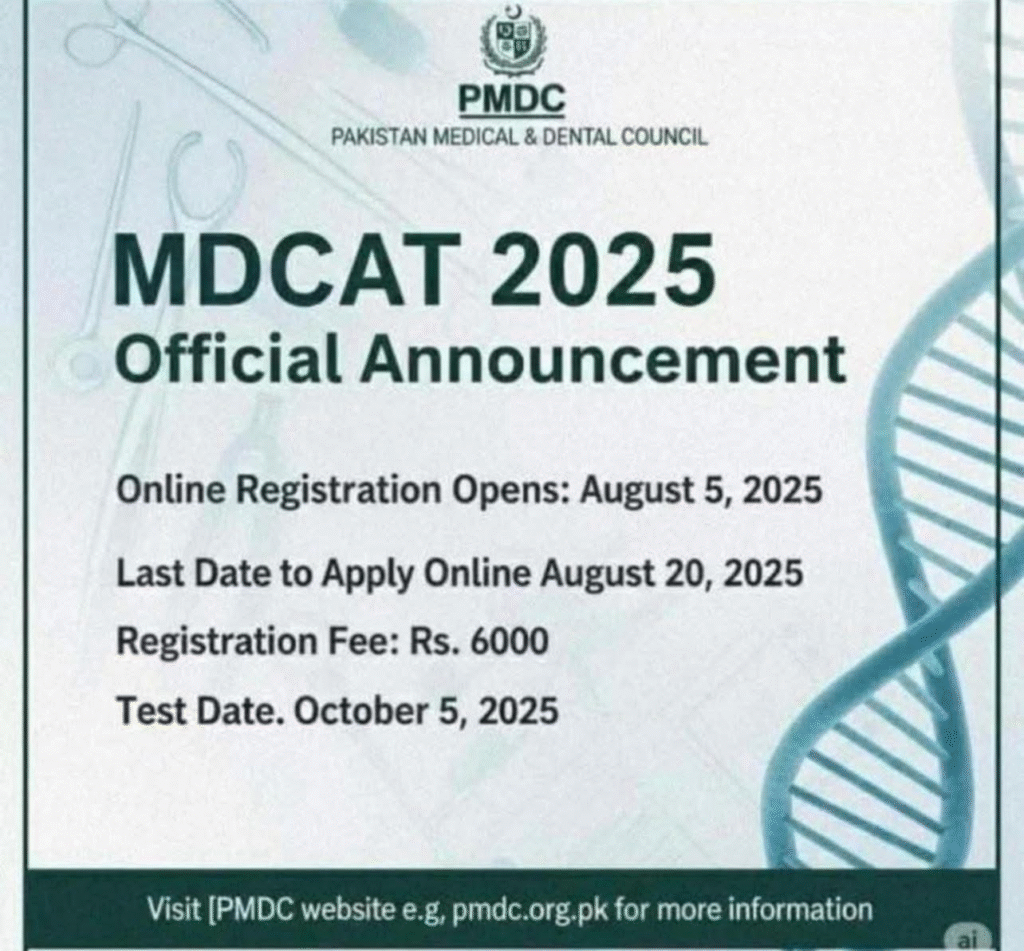 The Pakistan Medical and Dental Council (PMDC) has officially announced the MDCAT 2025 registration schedule, kicking off the journey for thousands of aspiring medical and dental students across Pakistan and abroad. If you’re planning to appear in this highly competitive exam, here’s a complete breakdown of the registration process, fee structure, and exam dates.